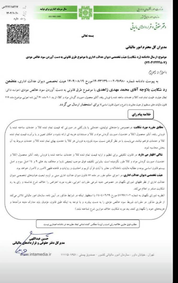 ابلاغیه دفتر حقوقی سازمان امور مالیاتی در رابطه با رد شکایت توسط هیئت تخصصی دیوان عدالت اداری با موضوع طرق قانونی به دست آوردن سود خالص مودی